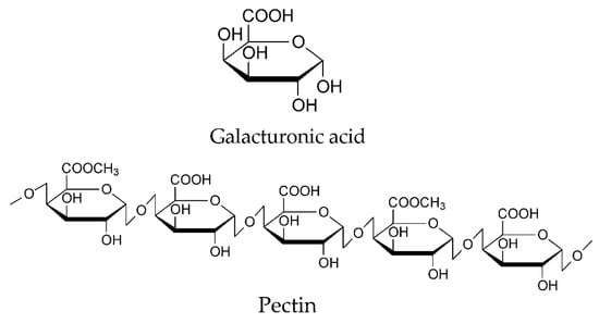 Galacturonic acid is a sugar acid that is a product from the oxidation of D-galactose. The acid groups along the chain are esterified with methoxy groups in different proportions. In addition, some of the hydroxy groups are acetylated. The chemistry of pectin is quite complex and possesses numerous properties, but the main uses are gelling, thickening, and as a stabilizer agent in food [73,102,103,104].