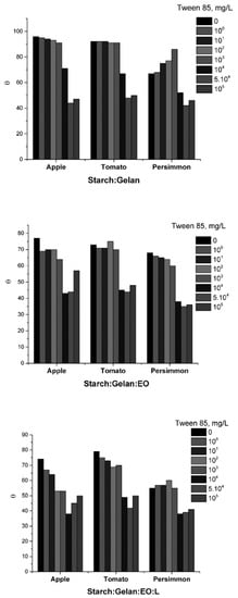 Andean blueberries [93] were protected using starch–glycerol films, the starch source being Colombian native potatoes: pacha negra, mora, and alcarrosa. For all three types of starch, the reduction in gas exchange was found to be approximately 27%. Corn starch, with hydroxypropyl methylcellulose, Uncaria gambir extract, and glycerol were used as the main ingredients for edible film preparation [94]. To assess the influence of gambir extract to edible film parameters, an experimental design and statistical analysis were used. It was observed that the optimal operational parameters are a 40% concentration of Uncaria gambir and 1000 rpm centrifugation for separation.