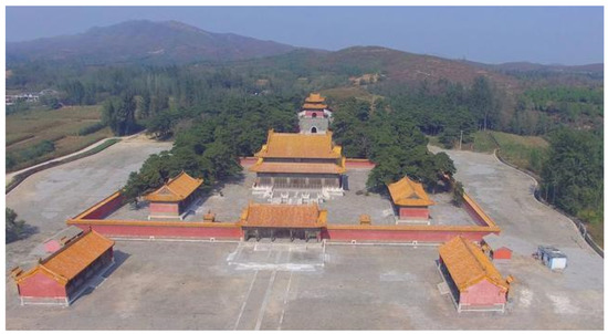 The Qing dynasty attached great importance to the construction and placement of the tombs because they believed in the continuation of life after death. The tombs are surrounded by mountains next to a river. This deals with the principles of Chinese geomancy or Feng shui, which is arranging objects so that good energy flows through one’s environment. The tombs are exquisite and superior constructions that reflect the highest technical level of tomb building of the Qing dynasty. Stones are precisely cut, carved marble archways supported by marble pillars, In the Qingxi tombs, there are many color paintings, especially in the inner eaves that were produced during the middle and late Qing dynasty, including the Qianlong period. These paintings are extremely rare and well-preserved. They represent the work of the greatest masters of art during this period and are an indispensable part of the Qingxi tombs. They are fully authentic, and the integrity reflects their value. Therefore, researching the pigments, painting materials and techniques of the color paintings of the Qingxi tombs has profound importance for the preservation of the culture of the Qing dynasty. A panoramic photo of Taidong Tomb is shown in Figure 1.