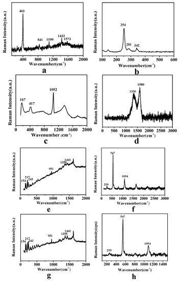 (a) Raman spectra for the blue pigment (azurite; 2CuCO3·Cu(OH)2) in M2 sample; (b) Raman spectra for the red pigment (vermilion; HgS) in M3 sample; (c) Raman spectra for the white pigment(lead-white; 2PbCO3·Pb(OH)2) in M4 sample; (d) Raman spectra for the black pigment (carbon black; C) in L1 sample; (e) Raman spectra for the green pigment (emerald green; Cu(CH3COO)2·3Cu(AsO2)2) in L2 sample; (f) Raman spectra for the blue pigment (ultramarine; (Na,Ca)8(AlSiO4)6(SO4,S,Cl)2) in L3 sample; (g) Raman spectra for the green pigment (emerald green; Cu(CH3COO)2·3Cu(AsO2)2) in X1 sample; (h) Raman spectra for the blue pigment (ultramarine; (Na,Ca)8(AlSiO4)6(SO4,S,Cl)2) in X2 sample.