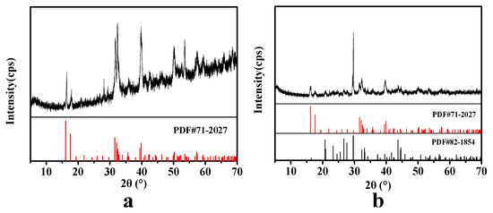 During the Ming and Qing Dynasties, the production process of the mortar in architectural paintings was very complicated. According to the observation of cross section in Figure 2, the architectural paintings of Taidong Tomb was similar to the process of Yi Ma Wu Hui of the Qing Dynasty [9]. The materials that were mainly used include tung oil, flour, lime water and fiber [24]. We analyzed the mortar layer b and the fiber layer c of the L2 samples in Figure 2. The type of fiber was determined by Herzberg stain, and the mortar layer b of L2 was ground into powder by agate mortar and characterized by X-ray diffraction and FTIR.