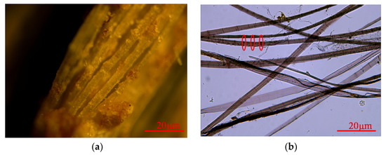 (a) Photo of untreated ramie fibers under a polarizing microscope at 20×; (b) photo of ramie fibers under a polarizing microscope at 20× and treated with Herzberg stain.