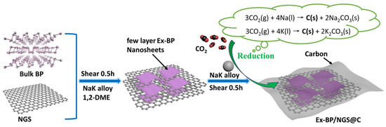 First, the bulk BP powder and NGS powder were mixed together with some sodium/potassium (NaK) alloy by a high-shearing treatment for 0.5 h. Bulk BP crystals were exfoliated into ultrathin nanosheets (Ex-BP) via simple shearing treatment in 1,2-dimethoxyethane (DME). Herein, the NGS was produced by directly chemical exfoliation of graphite in the presence of sodium-ammonia solution (experimental section). The liquid NaK alloy shows some intercalation properties for layered materials as well as a very strong reducibility [27,28]. As shown in Figure 1, Ex-BP nanosheets were directly exfoliated by the combined contribution of shearing-assistance and the chemical intercalation process. Second, the pure CO2 was subsequently added into this solution. Then, the amorphous carbon derived from CO2 reduction was used as the carbon coating. The conversion of CO2 into amorphous carbon coating was conducted by the following reactions: