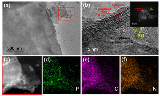 As shown in Figure 2, the transmission electron microscopy (TEM) and high-resolution TEM (HRTEM) images illustrated the morphologies of the 2D Ex-BP/NGS@C hybrids. The 2D structure of Ex-BP/NGS@C can be clearly observed in Figure 2a. The interlayer spacing of 0.21 nm corresponds toto the (002) lattice plane of Ex-BP nanosheets. As shown in Figure 2b, the HRTEM image with an interlayer spacing of 0.37 nm revealed that the NGS nanosheets contained about five layers. Furthermore, the amorphous carbon that was coated on the Ex-BP nanosheets can be clearly observed in the HRTEM image in Figure 2b. The corresponding fast Fourier transform image shows a dispersion ring that also demonstrates the existence of the amorphous carbon. TEM image of Ex-BP in Figure S2 presents a free-standing nanosheet, which demonstrated the successful exfoliation of the bulk BP. The thickness of Ex-BP is determined to be about ~3.6 nm by atomic force microscopy (AFM) observation (Figure S3) that corresponds to a few layers (5–7 layers) of sheets. The selective-area electron diffraction pattern (SAED) reveals the crystalline performance of Ex-BP nanosheets with [010] preferential orientation [29]. Figure 2e shows the elemental mapping for C, N and P of Ex-BP/NGS@C hybrid (Figure 2c,f). The uniform distribution of all elements clearly indicates that Ex-BP nanosheets have good contact with NGS and amorphous carbon.