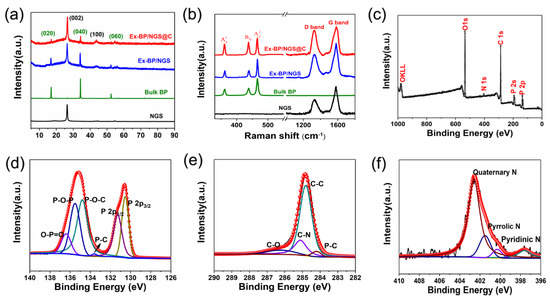 (a) XRD patterns of the Bulk BP, NGS, Ex-BP/NGS@C and Ex-BP/NGS. (b) Raman scattering spectra of the Bulk BP as well as NGS, Ex-BP/NGS@C and Ex-BP/NGS. (c–f) XPS survey and high-resolution XPS spectra of C 1s for Ex-BP/NGS@C.