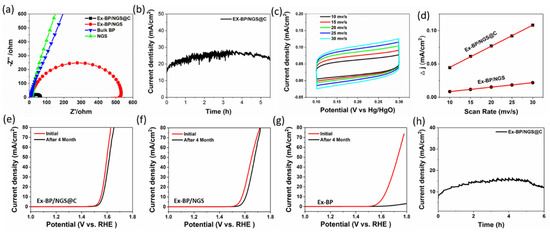 The charge transfer resistances (Rct) of all catalysts were assessed to understand the electrode kinetics of the studied catalysts for OER. We use electrochemical impedance spectrum (EIS) to evaluate the electrode kinetic parameters of materials in the electrocatalytic oxygen evolution reaction [14]. Figure 5a shows the EIS Nyquist plots for Ex-BP/NGS@C, Ex-BP/NGS, Ex-BP, Bulk BP and NGS catalysts at the onset potential. It was found that the Rct of the Ex-BP/NGS@C sample (63 Ω) is much smaller than those of other samples such as Ex-BP/NGS (520 Ω). The material with the best catalytic performance has the lowest charge transfer resistance. This indicates highly efficient electron transport and favorable OER kinetics at the Ex-BP/NGS@C electrolyte interface. Figure 5b show the long-term stability of Ex-BP/NGS@C. In the 5.5 h during which the oxygen evolution reaction continues, there is no significant decrease in current density, indicating that it can maintain catalytic activity for a longer period of time at a higher current density. To further unveil the electrochemically active area, the CV curves of Ex-BP/NGS@C at different sweep speeds were tested (Figure 5c). As shown in Figure 5d, ∆j is linear growth with sweep speeds; and the slop of the line is twice of the double-layer capacitance [36]. As a result, Ex-BP/NGS@C (3.16 mF cm−2) is larger than the slope of Ex-BP/NGS (0.67 mF cm−2). According to ECSA test comparison results, sample coated with carbon dioxide-derived carbon exhibit greater electrochemically active area, representing an increase in the effective oxygen evolution activity of electrolytic water.