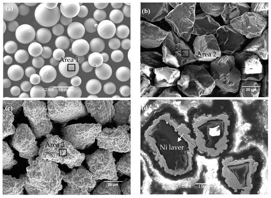 Morphologies of the Ti6Al4V, cubic boron nitride (cBN) powder and nickel-plated cBN powder (NicBN): (a) Ti6Al4V particles; (b) cBN particles; (c) NicBN particles; and (d) Ni coating.