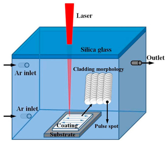 The particle volume ratios of cBN or NicBN vs. Ti6Al4V for producing the composite coatings raw material were the same (30 vol.% cBN + 70 vol.% Ti6Al4V and 30 vol.% NicBN + 70 vol.% Ti6Al4V). Both the cBN/Ti6Al4V and NicBN/Ti6Al4V composite coatings were prepared using the same process parameters. During the LC process, the parameters were 5 ms of pulse width, 150 A of current, 18 Hz of pulse frequency, 4 mm/s scanning speed, and 40% lap rate. The LC experiment was performed in a closed protective box filled with Ar gas. The box was made of high-temperature silica glass with a thickness of 3 mm. The laser beam passed through the silica glass to melt the composite powder. The schematic diagram is shown in Figure 2. Before the experiment, Ti6Al4V alloy powder was dried at 110 °C in a vacuum oven for 60 min.