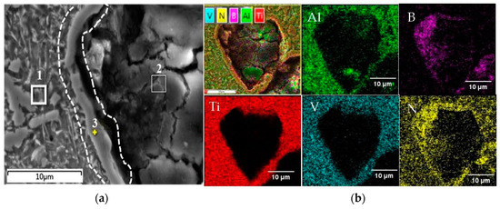 From Figure 5a, the Ti6Al4V matrix (area 1), interface (area 2), and cBN particle (area 3) were detected by means of the EDS analysis. The results of the elemental content at these three regions are reported in Table 2. The results show that the elements of areas 1 and 2 were essentially consistent with the original Ti6Al4V and cBN particles, respectively. However, the elements of area 3 at the reaction layer consisted of 79.23 wt.% Ti and 20.77 wt.% N elements, which indicate that the Ti element from the Ti6Al4V alloy and N element from cBN were prone to react and form a TixNy transition layer at the interface.