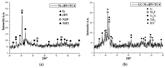 Combined with the microstructure and EDS analysis of the composite coating, NicBN particles were also prone to react with the Ti6Al4V matrix to form a submicron TixNy reaction layer. XRD analysis was applied on the NicBN/Ti6Al4V powder and LC composite coating as shown in Figure 6a,b, respectively. The diffraction result of the NicBN/Ti6Al4V composite powder was a Ti solid solution, with cBN, Ni2P, and NiP2. Both the Ni2P and NiP2 phases originated from the electroless nickel plating process. The phases of the NicBN/Ti6Al4V composite coating were composed of Ti solid solution, Ni3P, TiN, TiBx, and BN. According to the EDS and XRD results of the NicBN/Ti6Al4V composite coating, the cBN particles were partially decomposed into TiN and TiBx at the region between Ti6Al4V and cBN during the laser cladding process.