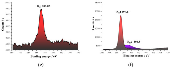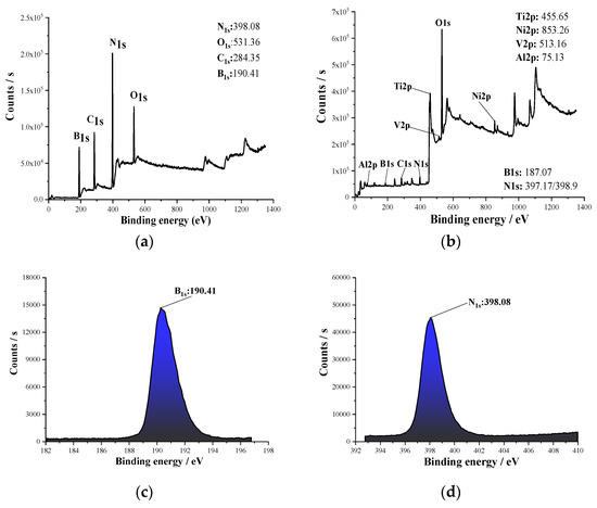 In order to further confirm the new phase in the NicBN/Ti6Al4V composite coating, the binding energy of B and N from the cBN powder and NicBN/Ti6Al4V composite coating were detected using XPS, which can be used to identify the compounds formed by the B and N elements. After the specimens were etched with argon ions for 60 s, the full-spectrum scanning and high resolution spectral analysis results of B and N of the cBN powder and composite coating were determined as demonstrated in Figure 7.