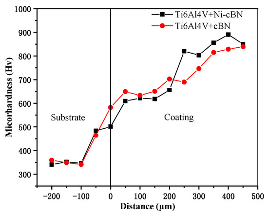 The hardness variation curves for the composite coatings obtained under an indentation load of 4.903 N (HV0.5) are presented in Figure 8. The average hardness of the NicBN/Ti6Al4V composite coating was 624.89 ± 191.64 HV and that of cBN/Ti6Al4V was 617.9 ± 169.87 HV. The hardness values of these two composite coatings are close. For both composite coatings, the hardness of the coating is much higher than that of the substrate, which is attributed to the reinforcement of hard cBN particles.