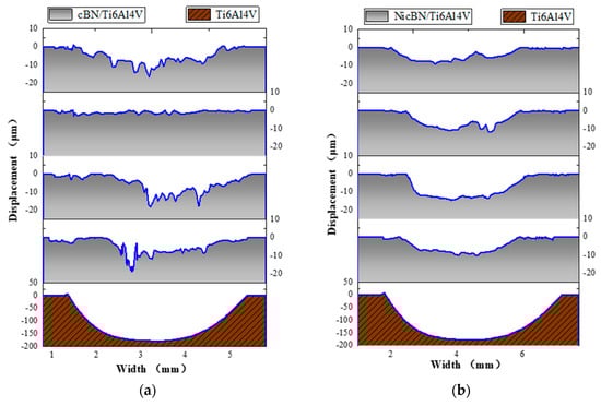 In order to further evaluate the abrasion loss, the cross-sectional profile curves of a worn track were operated at four different locations of circular grinding track using the step profiler scriber, which moved uniformly along a straight line at a load of 0.05 N. The displacement curves of the scriber are exhibited in Figure 10. From Figure 10a, the profile curve of the worn track of the cBN/Ti6Al4V composite coating irregularly fluctuated; thus, we were unable to accurately obtain the abrasive track width and area. However, the maximum abrasive depth of the cBN/Ti6Al4V composite coating was 18 μm.