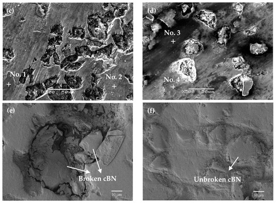 In order to further understand the wear test results, the worn tracks of the cBN/Ti6Al4V and NicBN/Ti6Al4V composite coatings were observed using SEM, as shown in Figure 11. We observed that the cBN particles in the cBN/Ti6Al4V composite coating were prone to crack and spall off, while the Ni-coated cBN particles in the NicBN/Ti6Al4V composite coating remained unbroken, as demonstrated in Figure 11a,b,e,f. In addition, as indicated in Figure 11a,b, the worn surface areas of the Si3N4 balls were different. Area 1 was 1.93 × 106 μm2 and area 2 was 1.55 × 106 μm2, which indicates that the scraping and grinding degrees of these two composite coatings were clearly different.