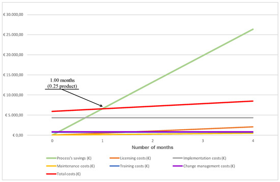 From the costs of developing a new product, we could confirm the justification of the digital transformation of the new paints and coatings development process. Still, it is also necessary to take into account the costs of process redesign and the implementation of an ICT solution that enables digital transformation. These costs vary significantly from company to company, so in the article, we have shown the costs of digital transformation in a selected example of a company. For the broader use of the research results, we designed a calculator to calculate the costs of process redesign and the implementation of ICT solutions. The calculator also calculates the rentability threshold (expressed in months) of use of the implemented ICT and the number of successfully developed new products. The calculator consists of an input window (Table 4) and display of the results in the table (Table 5) and graphical (Figure 2).