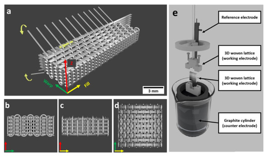 (a) A schematic of the 3D-woven lattice with warp, fill, and Z wires woven in three orthogonal directions; (b) 2D view in fill direction; (c) 2D view in warp direction; (d) 2D view in Z direction; (e) a schematic of the modified 3D electrodeposition system consisting of a working electrode (3D-woven lattice), counter electrode (graphite cylinder), and a reference electrode (Hg/HgSO4).