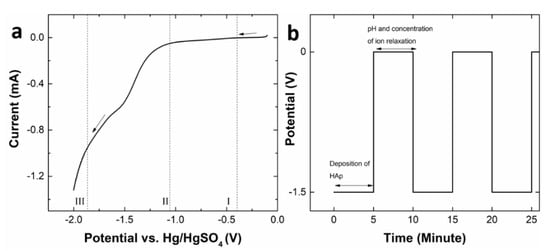 (a) Linear sweep voltammetry curve for hydroxyapatite (HAp) formation on stainless-steel (SS) 3D-woven lattice in an electrolyte containing 15 mM Ca(NO3)2·4H2O, 9 mM NH4H2PO4, and 30 mM NaNO3. The potential was swept from open-circuit potential (OCP) to −2.0 V, at a rate of 20 mV/s and a temperature of 50 °C. (b) Schematic diagram of deposition waveforms used in the electrodeposition coating process.