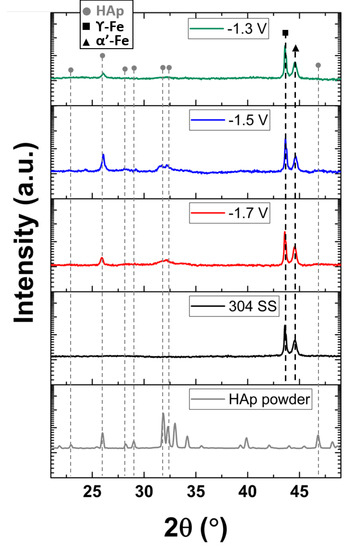 Figure 5 shows the X-ray diffraction patterns of coatings deposited onto SS plates. All peaks not associated with SS can be assigned to the most intense crystalline planes of HAp based on the XRD pattern of the HAp reference powder and the standard powder diffraction files (JCPDS, PDF#01-072-1243). The strong peaks at 2θ = 25.9°, 31.8°, and 32.2° correspond to the (002), (211), and (112) planes. The unusually strong peak at 25.9° for the coatings compared to the reference HAp powders indicates that the HAp crystals grow in the preferred direction of [002] during the electrodepositions. This corresponds to the crystals growing with their c-axis perpendicular to the electrode surface, as reported in earlier electrodepositions [61,62,63,64]. Coatings deposited at potentials of −1.3 and −1.7 V generate broad peaks with relatively low intensities from around 31° to 33°. This is indicative of a thin coating and/or fine crystals, which could be due to the low deposition rate at −1.3 V and the interference of hydrogen bubble formation at −1.7 V, respectively. The coatings deposited at −1.5 V are stronger and sharper, indicating thicker films and/or larger crystals. Overall, the XRD results suggest that the coatings deposited onto the 3D SS woven lattice under similar deposition conditions as the SS plates samples will also contain crystallized HAp.
