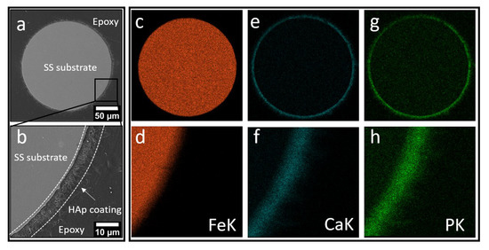 The cross-sectional SEM images in Figure 6a,b show a uniform HAp coating adhering to the wires following deposition at −1.5 V. Porosity is observed in the coating and corresponds to the surface morphology seen in Figure 3. The absence of delamination from the wires or crack along the wire/coating interface, particularly after mechanical polishing of the sample, suggests that the adhesion of the coating to the wires is strong. The EDS analysis shows a uniform distribution of calcium and phosphorus in the coatings.