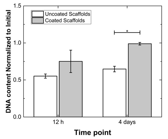 To quantify the effect of the HAp coating on both cellular adhesion and proliferation, ASCs were seeded on scaffolds and cultured for 12 h and 4 days. The 12 h time scale allows cells the opportunity to adhere to the surface without providing significant time to proliferate. After normalizing to the initial DNA seeded on each group, we observed that the HAp coating increases initial cell seeding efficiency by approximately 20%. Furthermore, after 4 days of culture, ASCs cultured on HAp-coated stainless-steel scaffolds had increased by 32%, whereas ASCs on the uncoated proliferated only 17% (Figure 9). Together, these results suggest that coating stainless-steel scaffolds with HAp using electrodeposition can improve cellular adhesion.