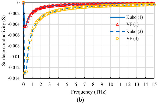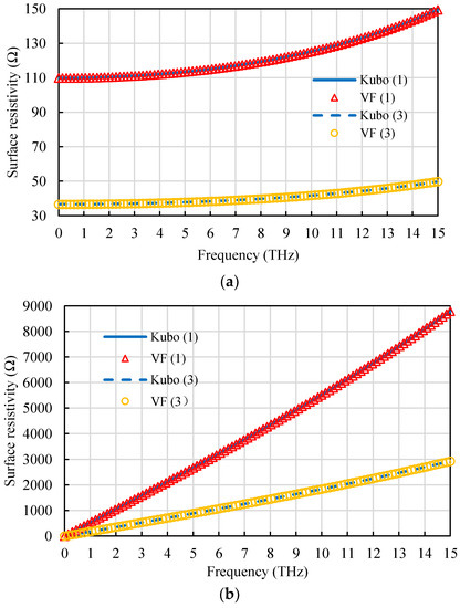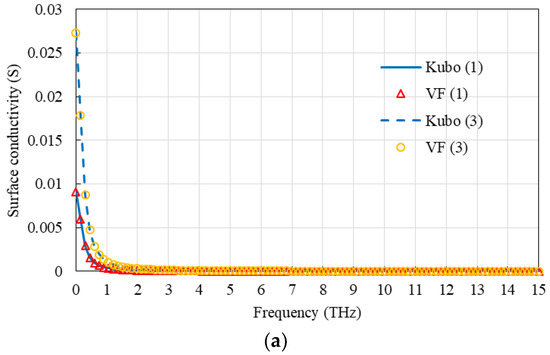 Multilayer graphene’s frequency domain surface resistivity/conductivity computed by the Kubo formula [22,23,24] can be tuned by number of layers, operation frequency, chemical potential, scattering rate (relaxation time), and temperature. The vector fitting method approximates the dispersive frequency domain graphene surface resistivity/conductivity using several pairs of complex conjugate poles and residues as: