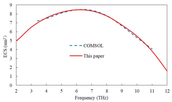 Furthermore, the wide frequency band information can be obtained after the Fourier transform of the time domain solution. The example results of the bistatic radar cross section (RCS) at 1.06, 7.2, and 12.9 THz agree well with those obtained via FEKO in Figure 6 (N = 1 and N = 3 denote monolayer and trilayer graphene). θ and φ are the elevation angles and azimuth angles, respectively. Besides, the extinction cross section (ECS) [37], which is more interesting at THz and optical frequencies, is displayed and compared with the COMSOL simulation in Figure 7. It shows good agreement between the two curves.
