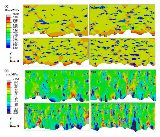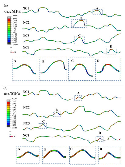The Mises, normal σ22 and shear stress σ12 distribution of TC in NC1–NC4 coatings are in Figure 4. From Figure 4, all the types of stresses are highly dependent on the surface roughness of BC/TC interface or UNP/crystalline region’s interface. For the mises stress in Figure 4a, due to the loose distribution structure, low elastic modulus and low density, thermal stress inside the UNPs presented the lowest value, thermal stress inside the UNPs presented the lowest value (blue area, 150–317 MPa) and the stress in the vicinity of the unmelted nano-particle was higher (green area, 317–483 MPa), whereas the stress in the crystalline regions was the highest (yellow and red areas, >483 MPa). The above results suggested that the increase of unmelted nano-particle content (UNCs) played a decisive role in reducing the overall thermal stress. The tangential stress σ in plane can be expressed thusly [34]: