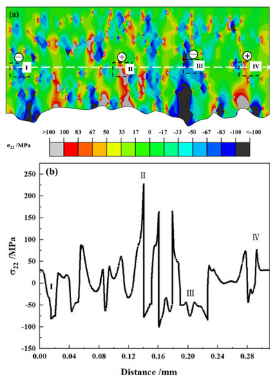 To further characterize the role of UNPs in the stress distribution in TC, the tensile stress σ22 in NC4 along the predefined path with white line was extracted as shown in Figure 5. The positive “+” and negative “−” signs are used to visually represent the tensile and compressive stresses (see Figure 5a), respectively. There were many UNPs continually appearing along the white line, and the tensile and compressive stresses were gradually alternated. In addition, the value of stress significantly increased around the UNPs (see Figure 5b). In the crystalline region far away from the UNPs, the value of tensile stress in the crystalline region nearly stayed at 0–33 MPa, which was even lower than that of area around the UNPs, indicating that the UNPs can reduce the overall stress of TC.
