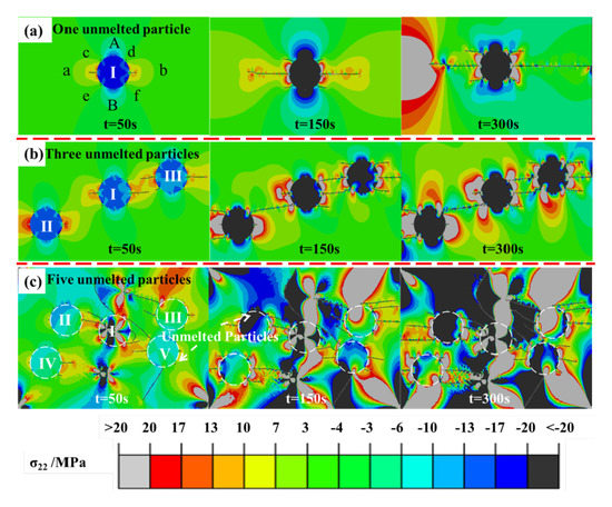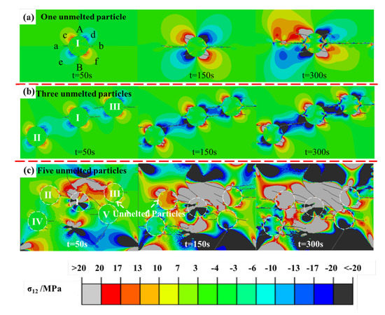 To better understand the failure modes and processes of nanostructured TBCs, some cracks in various orientations, such as parallel, perpendicular and 45° to the x-axis, were predefined at the UNPs/crystalline region interface, as shown in Figure 3a. The XFEM method was employed to stimulate the propagation paths of cracks. Figure 8 and Figure 9 showed the time-dependent crack propagation and stress distribution in TBCs with various UNCs during thermal cycling. As seen from Figure 8a and Figure 9a, there was only one unmelted nano-particle per unit area system, corresponding to the condition of low UNCs (NC1 and NC2). At the early stage, two horizontal cracks propagated parallel to the x-axis and then the propagation directions were mainly kept parallel to the x-axis under the tensile stress σ22. The cracking due to stress-induced was prevented by the presence of compressive stress at the inner of the UNPs. The four cracks 45° from x/y-axis gradually propagated parallel to the x-axis due to the increased tensile stress σ22 from 50 s to 150 s, indicating that the time-dependent crack propagation path was mainly determined by the tensile stress σ22. Figure 8b and Figure 9b showed three UNPs per unit area, which simulated the condition with medium UNCs like NC3. Six predefined cracks, including two cracks parallel to the x-axis and the other four 45° from the x/y-axis, propagated under the stress σ22 and σ12. As seen from Figure 8b and Figure 9b, two horizontal cracks propagated parallel to the x-axis at the early stage and then the propagation direction kept constant under the tensile stress. Four cracks with 45° from x/y-axis propagated slowly under the shear stress σ12. However, in the final stage their propagation direction turned parallel to the x-axis due to the expanded area of tensile stress with the increase of thermal cycle. Figure 8c and Figure 9c show five UNPs per unit area, corresponding to the condition with the high content of unmelted nano-particles such as NC4. The propagation tendencies of six cracks including those parallel to the x-axis and 45° from the x/y-axis were similar to the condition with one unmelted nano-particle. The tensile or shear stress areas were around the unmelted nano-particle I in the initial stage because a complex thermal stress area was formed by the accumulation of nano-particles [17,35]. In the final stage, both the tensile stress and shear stress coexisted inside the UNPs. Moreover, the length of the cracks with 45° from x/y-axis in the unmelted nano-particle was smaller, suggesting that firstly the mode II dominated the crack growth mode and it shifted to mixed mode until the crack propagated parallel to the x-axis. The influence of the shear stress on the longitudinal crack propagation behavior became more and more significant. Therefore, it can be predicted that the micro-cracks would enter into the nano-particles and were finally inclined to form some horizontal cracks, resulting in the spallation of TBCs.