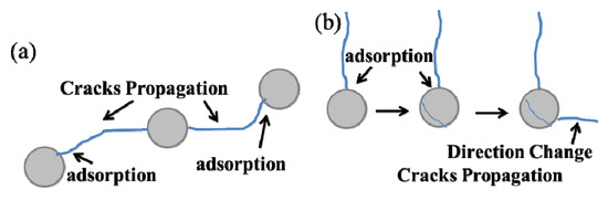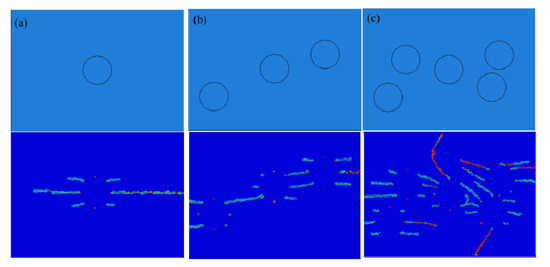 - Propagation of horizontal cracks: Under the tensile and shear stress, the cracks mainly propagated along the horizontal direction. The predefined cracks with 45° from the x/y-axis were a type I and II mixed-mode cracks. These cracks propagated along the direction parallel to the x-axis since the tensile stress σ22 and the shear stress σ12 were the main driving forces for the cracks propagation.