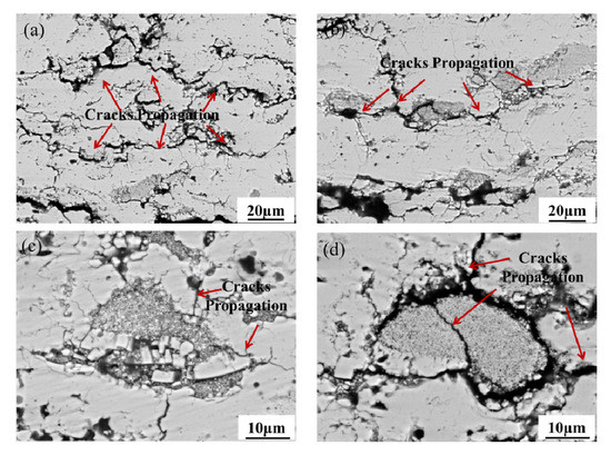 Figure 11 shows the experimental results from the thermal cycling test. As can be seen from Figure 11a,b, the crack propagated mainly along the horizontal direction at the UNPs/crystalline region interface. When the UNCs is relatively low, it is easy to form some penetrating horizontal cracks. However, these cracks cannot enter into the UNPs, which can effectively prevent the propagation of cracks (see Figure 11c). With the increase of UNCs, the UNPs show an obvious “capture effect” on the surrounding cracks (see Figure 11d). The experimental results are in a good keeping with the simulation ones. Figure 12 gives the schematic diagram of the “capture effect” of UNPs. The UNPs and surrounding microcracks had a mutual interaction effect on the stress concentration and crack propagation. As shown in Figure 12a, due to the compressive stress generated inside or around the UNPs, some cracks can only propagate towards the tensile stress zone of the adjacent UNPs. When the unmelted nano-particle was gradually subjected to sintering and the nanostructure gradually disappeared, the crack could enter into the unmelted nano-particle accompanied by the change of propagation direction (see Figure 11d and Figure 12b).