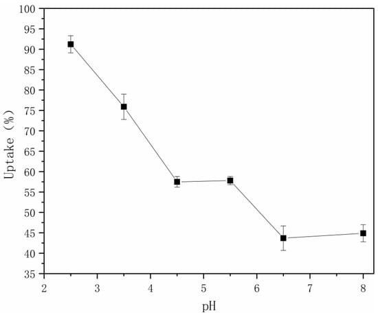 The most critical factor influencing wool dyeing is pH, because wool has an isoelectric point [34]. This is the key variable regarding exploration of the impact of pH on wool dyeing, and this article explores changes in pH from 2.5 to 8, at a dyeing time of 60 min, and with 2% owf modified pigment. Figure 4 shows that with the increase of pH, the uptake of pigments decreased. The highest uptake was 91.2% with pH 2.5, so we can say that the rate of dyeing increased as pH decreased. Dyeing under the condition of acid or alkali will produce larger damage to fabric, so a pH of 2.5 should be chosen to reach a better result.