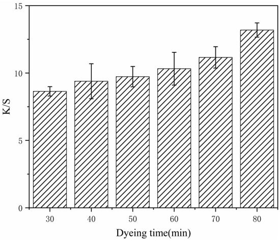 K/S value is often used to indicate the apparent color depth of dyed fabrics. When the value is higher, the dyeing color is better. We studied the change of K/S over time at pH 2.5 and with 2% owf modified pigment. As shown in Figure 6, it can be seen that the K/S value increased with the extension of dyeing time. At 80 min, the K/S value of the fabric reached 13.19, indicating that the fabric was deeply dyed [34,35,36]. Considering the influence of too-long dyeing times on production and processing, the dyeing time of 80 min was able to achieve a better effect.