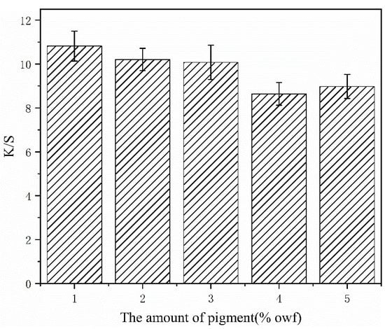 The amount of pigment can affect the contact probability between pigment and fabric, as well as the complete dyeing of fabric. Therefore, at pH 2.5 and a dyeing time 60 min, we analyzed the change of K/S value with the amount of pigment. As shown in Figure 7, the K/S value was maximum at 1% owf. When the amount of pigment was increased, the K/S decreased and did not have the expected effect. Considering the influence of dyeing fastness on color fading in later tests, the data from the experiment and the color depth of dyeing liquid after dyeing were used to comprehensively determine that the pigment dosage at 2% owf could achieve a better effect.