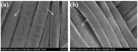 In order to compare the chromaticity distribution of modified pigment and dye on dyed wool yarn, the dyed fabric, with modified pigment and Acid Blue 93, was sliced and observed by SEM. The result is shown in Figure 8. The modified pigment was obviously present on the surface of the fiber, and there was a large number of concentrated large particles deposited on the fiber, indicating that the pigment could be properly dyed on the fiber [38]. The Acid Blue 93 dyeing fiber had no obvious large particle deposition on the surface, and the wool scale layer could also be clearly seen, indicating that more dye had entered into the fiber, so the permeability was better. The reason is that the particle size of the modified pigment was larger than the dye.