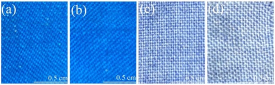 Fabric dyed with modified pigment without a light fastness test (a) and with a light fastness test (b); fabric dyed with acid dye without a light fastness test (c) and with a light fastness test (d).