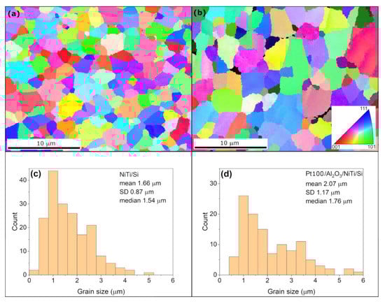 As for the grain size distribution change due to the Pt and Al2O3 ALD processes, there was a minor increase of NiTi grains in sample Pt100 (Figure 2a–d). However, the examined areas in samples NiTi and Pt100 were too small to be statistically significant. The main purpose of the EBSD measurements was to make sure that the exposure of the NiTi film to temperatures as high as 300 °C did not result in a remarkable change of the grain size distribution.