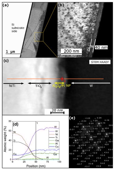 Figure 3a,b shows the TEM cross-sectional micrographs of sample Pt100, with low (a) and high magnification (b). The Si substrate in the low-magnification image is seen in a light color whereas the W layer (deposited via gas injection system (GIS) to manipulate Pt100 lamella) is seen in a dark color. The high-angle annular dark-field scanning transmission electron microscopy (HAADF STEM) image shows the upper layers in the cross-section (Figure 3c). The path of the line scan with a fixed point denoted as point 1 are shown in the image whereas the results of the EDS analysis along the line are shown in Figure 3d. The presence of Ga, Cu and W elements originates from Ga focused ion beam used to cut out the examined lamella, a Cu ring used as a support for the lamella and GIS material, respectively. The electron diffraction pattern taken from the SAED (selected area electron diffraction) inside of a NiTi grain is shown in Figure 3e. The pattern corresponds to the R-phase (the rhombohedral structure); the zone axis was [−121].