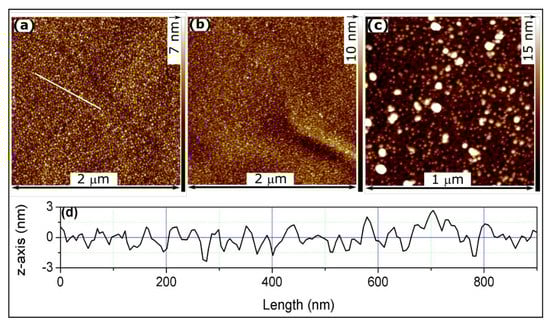 The atomic force microscope (AFM) topography images of NiTi sample’s surface (forces 500 pN) (a), Alu10 sample’s surface (forces 500 pN) (b) and Pt100 sample’s surface (the maximum interaction force was 5 nN; measured simultaneously with local conductivity (Figure 5c)) (c). The white line in subfigure (a) indicates positions of the cross section analysis (d).