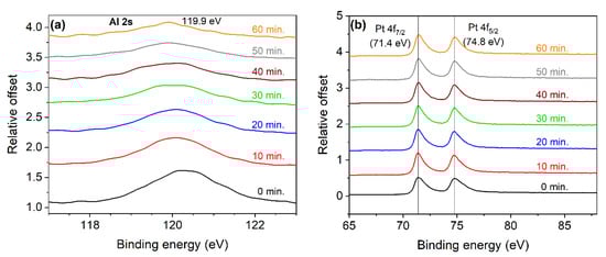 The measured XPS spectra attributed to Al (a) and Pt (b) after various etching times.