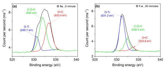 The measured and fitted XPS spectra attributed to O before etching (a) and after 30 min of Arn+ etching (b).
