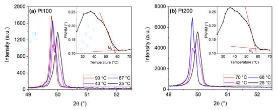 The transformation temperatures of sample NiTi and the Ms temperatures of samples Pt100 and Pt200 are summarized in Table 3. At room temperature each sample may contain both phases, austenite and martensite with crystal structures B19′ and B2, respectively. The diffractograms for the as-purchased NiTi film measured at various temperatures are shown in reference [53]. The diffractograms for samples Pt100 and Pt200 measured in the (110)B2 neighborhood at various temperatures between 25 and 90 °C are shown in Figure 9. Diffraction peaks (110)B2 are not shown for all the test temperatures but only for few selected temperatures in order to avoid accumulating too much data. The Ms temperatures for samples Pt100 and Pt200 are determined from the diagrams of FWHM (full width at half maximum) versus temperature (see the insets of Figure 9)