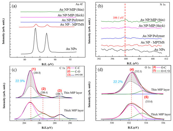 XPS spectra of the Au and Au NP/MIPs to analyze the present elements and groups in each step along the fabrication process. (a) spectra of the substrates corresponding to Au; (b) spectra of the substrates corresponding to N; (c,d) comparisons of the spectra of the Au NP/MIPs with thick and thin layer with respect to functional groups of C and O.