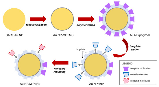 Schematic diagram of the stepwise procedures in the fabrication of Au NP/MIPs—Au NP functionalization with MPTMS followed by polymerization together with template molecules and subsequently, template elution to form molecular imprints wherein rebound molecules would enter during the detection process.