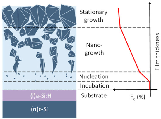 Hydrogen atoms play an important role in the growth of high-quality a-Si:H and nc-Si:H films. More precisely, with increasing atomic hydrogen within the plasma, a higher crystalline fraction results, indicating that H plays a decisive role in the nc-Si:H evolution [38]. In the grown film, H atoms are preferentially located in the amorphous phase or at the crystal grain boundaries due to the low solubility of H into the crystalline phase [39], contributing to passivation of dangling bonds. The material can show a wide range of structure evolution from fully amorphous to highly crystalline depending on the deposition parameters [40,41,42]. In Figure 1, we show a simplified sketch of the evolution of a nc-Si:H film. It is based on a four stages approach as was proposed by Cabarrocas et al. [43] and later supported by in situ ellipsometry studies [44,45]. In particular, the authors identified the presence of a critical incubation zone which is believed to control the transition from the amorphous to the nanocrystalline regime affecting the evolution and, consequently, the properties of the entire nc-Si:H film. Afterwards, the nanocrystalline phase increases progressively until the growth becomes stationary. The cone-shape crystal growth of the nc-Si:H film makes the crystalline fraction variable along the film thickness [7,46]. This aspect also influences the electrical and optical properties of the layer until the zone of stationary growth is reached.