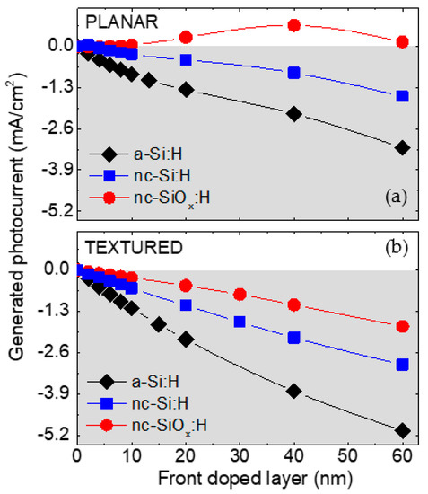 Simulated photocurrent absorbed in the c-Si wafer as a function of front doped layer thickness on (a) planar and (b) textured morphology. The nc-SiOx:H film used here has a refractive index of 2.7 at 633 nm. The values are reported as a difference relative to the structure with a 0 nm thick front layer. The grey areas indicate current losses. Figure adapted from [47].