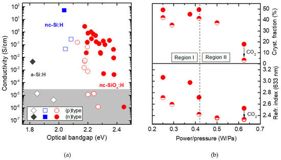 Simulated (a) electrical conductivity as function of optical band gap for p- and n- doped a-Si:H, nc-Si:H and nc-SiOx:H deposited at 300 and 500 H2/SiH4 ratio, respectively, and with various deposition parameters (i.e., power density, pressure and doping gas composition). Data adapted from [20,49]. The grey area indicates a critical regime where the bulk conductivity begins to contribute to the cell’s series resistance. (b) Top: Raman crystalline volume fraction and (b) Bottom: refractive index (at 633 nm) of doped (n)nc-SiOx:H from (a) as function of the power/pressure ratio and for variable CO2 flow (12–18 sccm). The other parameters are kept constant for all the films. The two deposition regimes are indicated as Region I and II. All the layers have a thickness in the range of 200–250 nm. Figure adapted from [47].