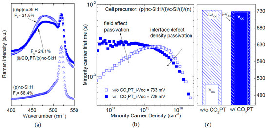 (a) Raman spectra as function of wavenumber of (p)nc-Si:H film on variable substrate layers (laser 442 nm). The extracted value of crystalline fraction (FC) is reported next to each spectrum. (b) Minority carrier lifetime measured on precursors fabricated on textured wafers with and without a CO2 plasma treatment with the same 25-nm thick (p)nc-Si:H layer. (c) Implied-VOC extracted from (b) and VOC measured on the completed cells. Figure adapted from [47].