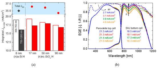 This observation inspired the use of nc-SiOx:H interlayer to enhance the NIR response of the Si bottom cell in a perovskite/silicon tandem cell with a front-flat bottom cell [74], which is required for fabrication of perovskite top cells by solution processes. Alternatively, thermally evaporated perovskite layers allow the use of a textured c-Si bottom cell [75,76] for enhanced light trapping. However, wet processes still provide the best perovskite top cells.