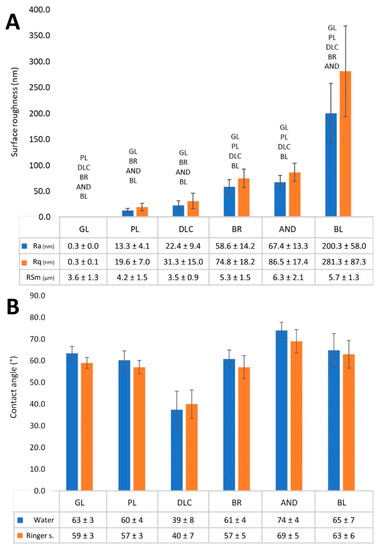 (A) Surface roughness values—average surface roughness (Ra), root mean square roughness (Rq), and mean value of the width of the profile irregularities (RSm) of the reference glass coverslips (GL) and of the Ti6Al4V samples modified by polishing (PL), by DLC-coating (DLC), by brushing (BR), by anodizing (AND), or by blasting (BL). (B) Wettability of the samples measured by the contact angle of a sessile drop of deionized water or Ringer’s solution on a freshly cleaned surface in air. Average ± SD from three samples (10 measurements on each sample), ANOVA, statistical significance p ≤ 0.05.